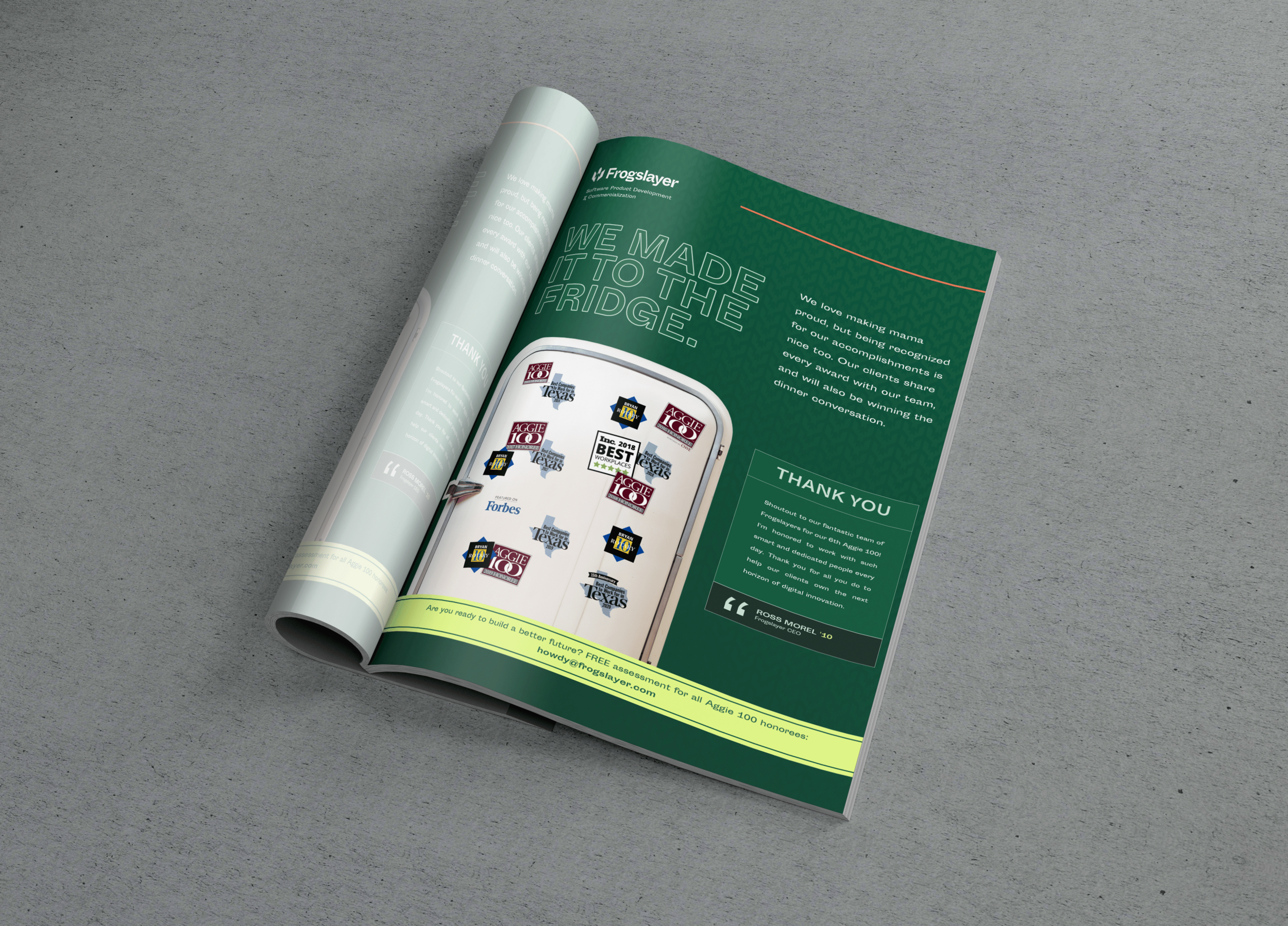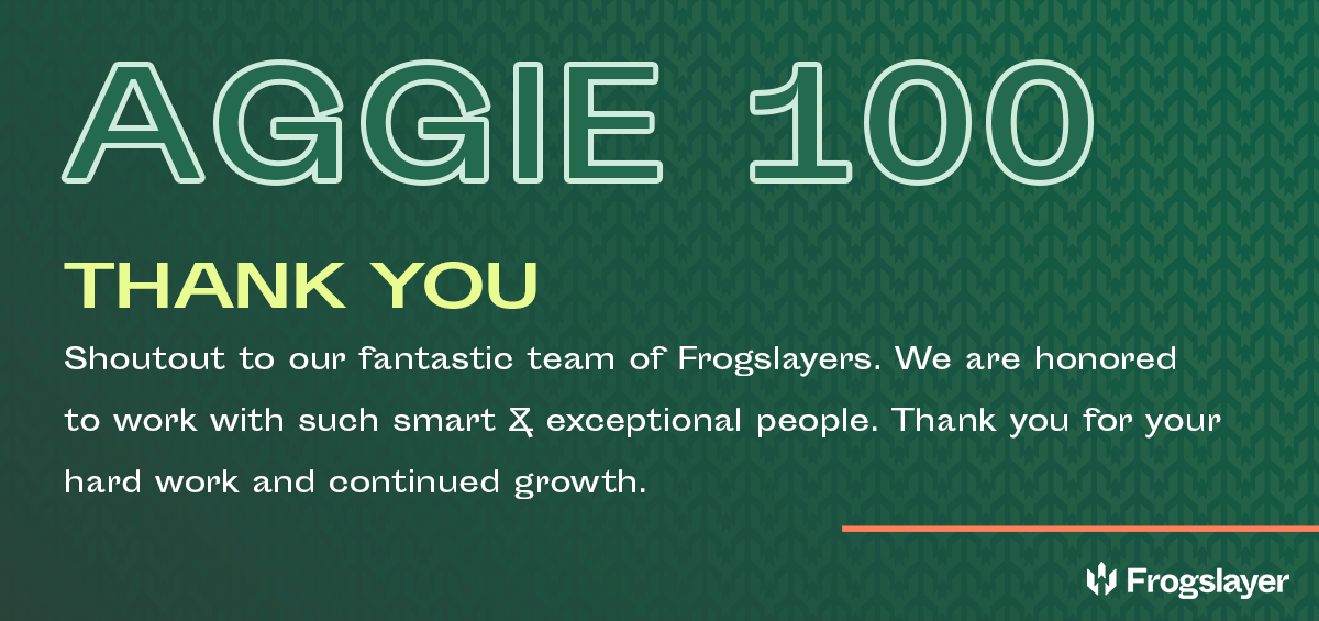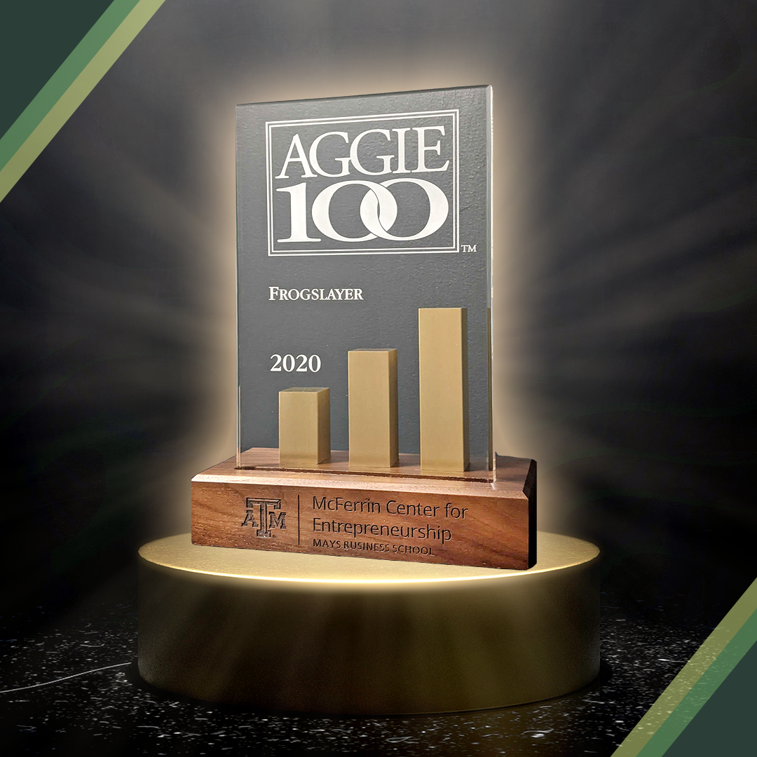 Frogslayer was nominated for an Aggie 100 award— an award designed to honor the 100 fastest growing Aggie-owned or Aggie-led businesses in the world.